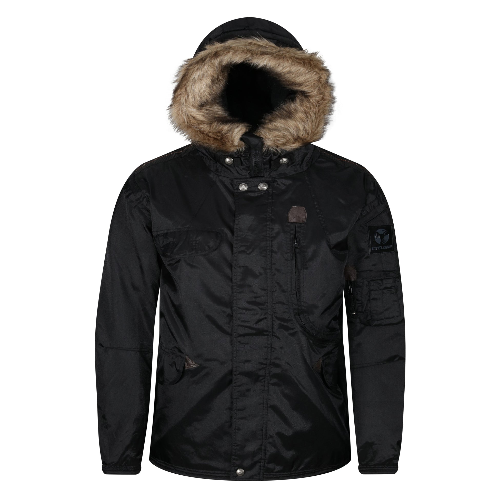 Snorkel-style hood with button and stud detachable faux fur trim